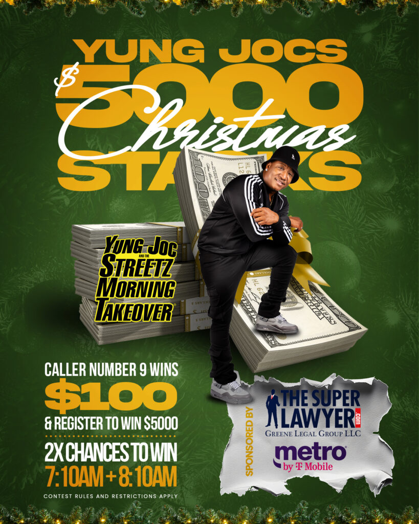 This holiday season, Yung Joc & The Streetz Morning Takeover is giving listeners a chance to win big with Yung Joc’s $5,000 Christmas Stacks — happening every weekday morning on Streetz 103.3/100.5 FM!